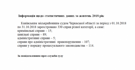 Канівським міськрайонним судом Черкаської області за період з 01.10.2018 по 31.10.2018 зареєстровано 330 справ різної категорії, а саме: