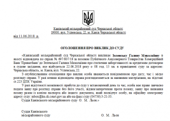 Канівський міськрайонний суд Черкаської області викликає Зеленську Галину Миколаївну в якості відповідача по справі № 697/807/18 за позовом Публічного Акціонерного Товариства Комерційний Банк 'Приватбанк' до Зеленської Галини Миколаївни про стягнення заборгованості за кредитним договором в судове засідання, яке відбудеться 22.06.2018 року о 08 год. 15 хв. в приміщенні суду за адресою: Черкаська область, м. Канів, вул. Успенська, 22.