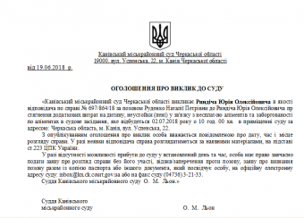 Канівський міськрайонний суд Черкаської області викликає Риндіча Юрія Олексійовича в якості відповідача по справі № 697/864/18 за позовом Руденко Наталії Петрівни до Риндіча Юрія Олексійовича про стягнення додаткових витрат на дитину, неустойки (пені) у зв'язку з несплатою аліментів та заборгованості по аліментах в судове засідання, яке відбудеться 02.07.2018 року о 10 год. 00 хв. в приміщенні суду за адресою: Черкаська область, м. Канів, вул. Успенська, 22.