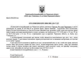 Канівський міськрайонний суд Черкаської області викликає Святуна Руслана Івановича в якості відповідача по справі № 697/888/18 за позовом Бурої Лариси Іванівни , Колупаєвої Юлії Вікентіївни, Бурого Віталія Вікентійовича до Святуна Руслана Івановича про визнання особи такою,що втратила право користування житловим приміщенням в судове засідання, яке відбудеться 17.07.2018 року о 10 год. 00 хв. та 18.07.2018 року о 10 год. 00 хв. в приміщенні суду за адресою: Черкаська область, м. Канів, вул. Успенська, 22.
