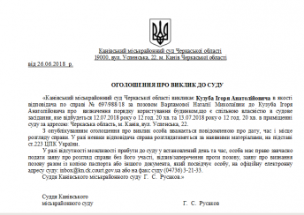 Канівський міськрайонний суд Черкаської області викликає Кузуба Ігоря Анатолійовича в якості відповідача по справі № 697/988/18 за позовом Варламової Наталії Миколаївни до Кузуба Ігоря Анатолійовича про визначення порядку користування будинком,що є спільною власністю в судове засідання, яке відбудеться 12.07.2018 року о 12 год. 20 хв. та 13.07.2018 року о 12 год. 20 хв. в приміщенні суду за адресою: Черкаська область, м. Канів, вул. Успенська, 22.