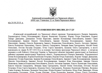 Канівський міськрайонний суд Черкаської області викликає Хорошковського Валерія Івановича, Хорошковську Олену Володимирівну, Ворону Валентину Петрівну, Ворону Петра Павловича, Ворону Тамару Дмитрівну, Демиденко Тетяну Борисівну, Іванину Володимира Олексійовича, Іванину Ганну Володимирівну, Іванину Миколу Олексійовича, Іванину Наталію Володимирівну, Іванину Ніну Миколаївну, Іванину Олексія Якимовича, Іванюту Владислава Олексійовича, Кикоть Антоніну Іванівну, Кикоть Валентину Миколаївну, Кикоть Миколу Сидоровича, Личмана Івана Григоровича, Маслій Олену Олексіївну, Петієву Наталію Петрівну, Пічку Сергія Івановича, Шалаєву Олега Григоровича, в якості відповідача по справі № 697/2434/16-ц за позовом Заступника прокурора Черкаської області в інтересах держави в особі Кабінету Міністрів України та Черкаської обласної державної адміністрації до Канівської районної державни адміністрація Черкаської області, Хорошковського Валерія Івановича, Хорошковської Олени Володимирівни, Ворони Валентини Петрівни, Ворони Петра Павловича, Ворони Тамари Дмитрівни, Демиденко Тетяни Борисівни, Іванини Володимира Олексійовича, Іваниної Ганни Володимирівни, Іванини Миколи Олексійовича, Іваниної Наталії Володимирівни, Іваниної Ніни Миколаївни, Іванини Олексія Якимовича, Іванюти Владислава Олексійовича, Кикоть Антоніни Іванівни, Кикоть Валентини Миколаївни, Кикотя Миколи Сидоровича, Личмана Івана Григоровича, Маслій Олени Олексіївни, Петієвої Наталії Петрівни, Пічки Сергія Івановича, Шалаєва Олега Григоровича, Яковенко Валентини Юріївни, Яковенко Ганни Ігорівни, Яковенко Людмили Олексіївни, Шпака Вадима Сергійовича, Шпак Ніни Давидівни, Шпака Володимира Петровича, Шпак Тетяни Юріївни, Шпак Валентини Іванівни, Шпака Сергія Петровича, Покотило Катерини Григорівни, Рудь Олександра Олексійовича, Шпак Раїси Іванівни, Семенюк (Маркушевої) Людмили Іванівни, Марченка Миколи Сергійовича, Северин Василя Івановича, Дишлюка Сергія Олександровича, Литвин Тамари Василівни, Дишлюк Надії Миколаївни, треті особи: сектор містобудування архітектури, житлово-комунального господарства, та з питань цивільного захисту Канівської РДА, Управління екології та природних ресурсів Черкаської обласної державної адміністрації, Управління Державного нагляду за дотриманням санітарного законодавства Головного управління Держпродспоживслужби в Черкаській області, Головне управління Держгеокадастру в Черкаській області, Управління культури Черкаської обласної державної адміністрації, Черкаське обласне управління лісового та мисливського господарства про визнання розпорядження недійсним та витребування земельної ділянки про визнання розпорядження недійсним та витребування земельних ділянок в судове засідання, яке відбудеться 24.07.2018 року о 11 год. 00 хв. . в приміщенні суду за адресою: Черкаська область, м. Канів, вул. Успенська, 22.
