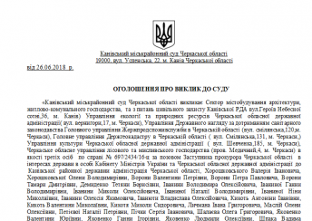 Канівський міськрайонний суд Черкаської області викликає Сектор містобудування архітектури, житлово-комунального господарства, та з питань цивільного захисту Канівської РДА вул.Героїв Небесної сотні,36, м. Канів) Управління екології та природних ресурсів Черкаської обласної державної адміністрації( вул. вернигори,17, м. Черкаси), Управління Державного нагляду за дотриманням санітарного законодавства Головного управління Жержпродспоживслужби в Черкаській області (вул. смілянська,120,м. Черкаси), Головне управління Держгеокадастру в Черкаській області ( вул. Смілянська,131, м. Черкаси,) Управління культури Черкаської обласної державної адміністрації ( вул. Шевченка,185, м. Черкаси), Черкаське обласне управління лісового та мисливського господарства (пров. Медичний,4, м. Черкаси) в якості третіх осіб по справі № 697/2434/16-ц за позовом Заступника прокурора Черкаської області в інтересах держави в особі Кабінету Міністрів України та Черкаської обласної державної адміністрації до Канівської районної державни адміністрація Черкаської області, Хорошковського Валерія Івановича, Хорошковської Олени Володимирівни, Ворони Валентини Петрівни, Ворони Петра Павловича, Ворони Тамари Дмитрівни, Демиденко Тетяни Борисівни, Іванини Володимира Олексійовича, Іваниної Ганни Володимирівни, Іванини Миколи Олексійовича, Іваниної Наталії Володимирівни, Іваниної Ніни Миколаївни, Іванини Олексія Якимовича, Іванюти Владислава Олексійовича, Кикоть Антоніни Іванівни, Кикоть Валентини Миколаївни, Кикотя Миколи Сидоровича, Личмана Івана Григоровича, Маслій Олени Олексіївни, Петієвої Наталії Петрівни, Пічки Сергія Івановича, Шалаєва Олега Григоровича, Яковенко Валентини Юріївни, Яковенко Ганни Ігорівни, Яковенко Людмили Олексіївни, Шпака Вадима Сергійовича, Шпак Ніни Давидівни, Шпака Володимира Петровича, Шпак Тетяни Юріївни, Шпак Валентини Іванівни, Шпака Сергія Петровича, Покотило Катерини Григорівни, Рудь Олександра Олексійовича, Шпак Раїси Іванівни, Семенюк (Маркушевої) Людмили Іванівни, Марченка Миколи Сергійовича, Северин Василя Івановича, Дишлюка Сергія Олександровича, Литвин Тамари Василівни, Дишлюк Надії Миколаївни, треті особи: сектор містобудування архітектури, житлово-комунального господарства, та з питань цивільного захисту Канівської РДА, Управління екології та природних ресурсів Черкаської обласної державної адміністрації, Управління Державного нагляду за дотриманням санітарного законодавства Головного управління Держпродспоживслужби в Черкаській області, Головне управління Держгеокадастру в Черкаській області, Управління культури Черкаської обласної державної адміністрації, Черкаське обласне управління лісового та мисливського господарства про визнання розпорядження недійсним та витребування земельної ділянки про визнання розпорядження недійсним та витребування земельних ділянок в судове засідання, яке відбудеться 24.07.2018 року о 11 год. 00 хв. в приміщенні суду за адресою: Черкаська область, м. Канів, вул. Успенська, 22.