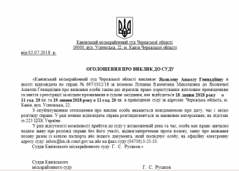 З опублікуванням оголошення про виклик особа вважається повідомленою про дату, час і місце розгляду справи. У разі неявки відповідача справа розглядатиметься за наявними матеріалами, на підставі ст.223 ЦПК України.
