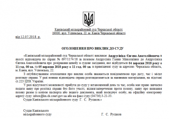 Канівський міськрайонний суд Черкаської області викликає Андрусініка Євгена Анатолійовича в якості відповідача по справі № 697/1174/18 за позовом Андрусінік Ганни Миколаївни до Андрусініка Євгена Анатолійовича про розірвання шлюбу в судове засідання, яке відбудеться 04 вересня 2018 року о 11 год. 00 хв. та 05 вересня 2018 року о 11 год. 00 хв. в приміщенні суду за адресою: Черкаська область, м. Канів, вул. Успенська, 22.