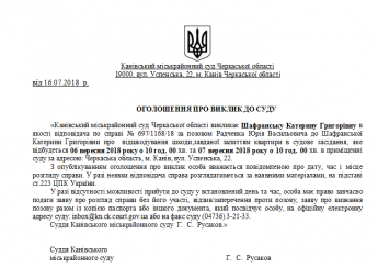 Канівський міськрайонний суд Черкаської області викликає Шафранську Катерину Григорівну в якості відповідача по справі № 697/1168/18 за позовом Радченка Юрія Васильовича до Шафранської Катерини Григорівни про відшкодування шкоди,завданої залиттям квартири в судове засідання, яке відбудеться 06 вересня 2018 року о 10 год. 00 хв. та 07 вересня 2018 року о 10 год. 00 хв. в приміщенні суду за адресою: Черкаська область, м. Канів, вул. Успенська, 22.