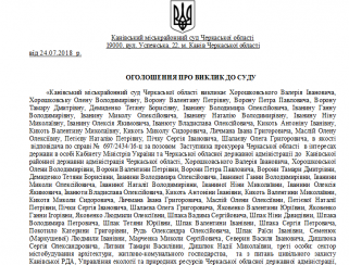 Канівський міськрайонний суд Черкаської області викликає Хорошковського Валерія Івановича, Хорошковську Олену Володимирівну, Ворону Валентину Петрівну, Ворону Петра Павловича, Ворону Тамару Дмитрівну, Демиденко Тетяну Борисівну, Іванину Володимира Олексійовича, Іванину Ганну Володимирівну, Іванину Миколу Олексійовича, Іванину Наталію Володимирівну, Іванину Ніну Миколаївну, Іванину Олексія Якимовича, Іванюту Владислава Олексійовича, Кикоть Антоніну Іванівну, Кикоть Валентину Миколаївну, Кикоть Миколу Сидоровича, Личмана Івана Григоровича, Маслій Олену Олексіївну, Петієву Наталію Петрівну, Пічку Сергія Івановича, Шалаєву Олега Григоровича, в якості відповідача по справі № 697/2434/16-ц за позовом Заступника прокурора Черкаської області в інтересах держави в особі Кабінету Міністрів України та Черкаської обласної державної адміністрації до Канівської районної державни адміністрація Черкаської області, Хорошковського Валерія Івановича, Хорошковської Олени Володимирівни, Ворони Валентини Петрівни, Ворони Петра Павловича, Ворони Тамари Дмитрівни, Демиденко Тетяни Борисівни, Іванини Володимира Олексійовича, Іваниної Ганни Володимирівни, Іванини Миколи Олексійовича, Іваниної Наталії Володимирівни, Іваниної Ніни Миколаївни, Іванини Олексія Якимовича, Іванюти Владислава Олексійовича, Кикоть Антоніни Іванівни, Кикоть Валентини Миколаївни, Кикотя Миколи Сидоровича, Личмана Івана Григоровича, Маслій Олени Олексіївни, Петієвої Наталії Петрівни, Пічки Сергія Івановича, Шалаєва Олега Григоровича, Яковенко Валентини Юріївни, Яковенко Ганни Ігорівни, Яковенко Людмили Олексіївни, Шпака Вадима Сергійовича, Шпак Ніни Давидівни, Шпака Володимира Петровича, Шпак Тетяни Юріївни, Шпак Валентини Іванівни, Шпака Сергія Петровича, Покотило Катерини Григорівни, Рудь Олександра Олексійовича, Шпак Раїси Іванівни, Семенюк (Маркушевої) Людмили Іванівни, Марченка Миколи Сергійовича, Северин Василя Івановича, Дишлюка Сергія Олександровича, Литвин Тамари Василівни, Дишлюк Надії Миколаївни, треті особи: сектор містобудування архітектури, житлово-комунального господарства, та з питань цивільного захисту Канівської РДА, Управління екології та природних ресурсів Черкаської обласної державної адміністрації, Управління Державного нагляду за дотриманням санітарного законодавства Головного управління Жержпродспоживслужби в Черкаській області, Головне управління Держгеокадастру в черкаській області, Управління культури Черкаської обласної державної адміністрації, Черкаське обласне управління лісового та мисливського господарства про визнання розпорядження недійсним та витребування земельної ділянки про визнання розпорядження недійсним та витребування земельних ділянок в судове засідання, яке відбудеться 06.08.2018 року о 11 год. 00 хв. в приміщенні суду за адресою: Черкаська область, м. Канів, вул. Успенська, 22.