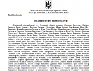 Канівський міськрайонний суд Черкаської області викликає Яковенко Валентину Юріївну, Яковенко Ганну Ігорівну, Яковенко Людмилу Олексіївну, Шпака Вадима Сергійовича, Шпак Ніну Давидівну, Шпака Володимира Петровича, Шпак Тетяну Юріївну, Шпак Валентину Іванівну, Шпака Сергія Петровича, Покотило Катерину Григорівну, Рудь Олександра Олексійовича, Шпак Раїсу Іванівну, Семенюк (Маркушеву) Людмилу Іванівну, Марченка Миколу Сергійовича, Северин Василя Івановича, Дишлюка Сергія Олександровича, Литвин Тамару Василівну, Дишлюк Надію Миколаївну, в якості відповідачів по справі № 697/2434/16-ц за позовом Заступника прокурора Черкаської області в інтересах держави в особі Кабінету Міністрів України та Черкаської обласної державної адміністрації до Канівської районної державни адміністрація Черкаської області, Хорошковського Валерія Івановича, Хорошковської Олени Володимирівни, Ворони Валентини Петрівни, Ворони Петра Павловича, Ворони Тамари Дмитрівни, Демиденко Тетяни Борисівни, Іванини Володимира Олексійовича, Іваниної Ганни Володимирівни, Іванини Миколи Олексійовича, Іваниної Наталії Володимирівни, Іваниної Ніни Миколаївни, Іванини Олексія Якимовича, Іванюти Владислава Олексійовича, Кикоть Антоніни Іванівни, Кикоть Валентини Миколаївни, Кикотя Миколи Сидоровича, Личмана Івана Григоровича, Маслій Олени Олексіївни, Петієвої Наталії Петрівни, Пічки Сергія Івановича, Шалаєва Олега Григоровича, Яковенко Валентини Юріївни, Яковенко Ганни Ігорівни, Яковенко Людмили Олексіївни, Шпака Вадима Сергійовича, Шпак Ніни Давидівни, Шпака Володимира Петровича, Шпак Тетяни Юріївни, Шпак Валентини Іванівни, Шпака Сергія Петровича, Покотило Катерини Григорівни, Рудь Олександра Олексійовича, Шпак Раїси Іванівни, Семенюк (Маркушевої) Людмили Іванівни, Марченка Миколи Сергійовича, Северин Василя Івановича, Дишлюка Сергія Олександровича, Литвин Тамари Василівни, Дишлюк Надії Миколаївни, треті особи: сектор містобудування архітектури, житлово-комунального господарства, та з питань цивільного захисту Канівської РДА, Управління екології та природних ресурсів Черкаської обласної державної адміністрації, Управління Державного нагляду за дотриманням санітарного законодавства Головного управління Держпродспоживслужби в Черкаській області, Головне управління Держгеокадастру в Черкаській області, Управління культури Черкаської обласної державної адміністрації, Черкаське обласне управління лісового та мисливського господарства про визнання розпорядження недійсним та витребування земельної ділянки про визнання розпорядження недійсним та витребування земельних ділянок в судове засідання, яке відбудеться 06.08.2018 року о 11 год. 00 хв. в приміщенні суду за адресою: Черкаська область, м. Канів, вул. Успенська, 22.