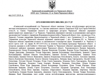 Канівський міськрайонний суд Черкаської області викликає Сектор містобудування архітектури, житлово-комунального господарства, та з питань цивільного захисту Канівської РДА вул.Героїв Небесної сотні,36, м. Канів) Управління екології та природних ресурсів Черкаської обласної державної адміністрації( вул. вернигори,17, м. Черкаси), Управління Державного нагляду за дотриманням санітарного законодавства Головного управління Жержпродспоживслужби в Черкаській області (вул. смілянська,120,м. Черкаси), Головне управління Держгеокадастру в Черкаській області ( вул. Смілянська,131, м. Черкаси,) Управління культури Черкаської обласної державної адміністрації ( вул. Шевченка,185, м. Черкаси), Черкаське обласне управління лісового та мисливського господарства (пров. Медичний,4, м. Черкаси) в якості третіх осіб по справі № 697/2434/16-ц за позовом Заступника прокурора Черкаської області в інтересах держави в особі Кабінету Міністрів України та Черкаської обласної державної адміністрації до Канівської районної державни адміністрація Черкаської області, Хорошковського Валерія Івановича, Хорошковської Олени Володимирівни, Ворони Валентини Петрівни, Ворони Петра Павловича, Ворони Тамари Дмитрівни, Демиденко Тетяни Борисівни, Іванини Володимира Олексійовича, Іваниної Ганни Володимирівни, Іванини Миколи Олексійовича, Іваниної Наталії Володимирівни, Іваниної Ніни Миколаївни, Іванини Олексія Якимовича, Іванюти Владислава Олексійовича, Кикоть Антоніни Іванівни, Кикоть Валентини Миколаївни, Кикотя Миколи Сидоровича, Личмана Івана Григоровича, Маслій Олени Олексіївни, Петієвої Наталії Петрівни, Пічки Сергія Івановича, Шалаєва Олега Григоровича, Яковенко Валентини Юріївни, Яковенко Ганни Ігорівни, Яковенко Людмили Олексіївни, Шпака Вадима Сергійовича, Шпак Ніни Давидівни, Шпака Володимира Петровича, Шпак Тетяни Юріївни, Шпак Валентини Іванівни, Шпака Сергія Петровича, Покотило Катерини Григорівни, Рудь Олександра Олексійовича, Шпак Раїси Іванівни, Семенюк (Маркушевої) Людмили Іванівни, Марченка Миколи Сергійовича, Северин Василя Івановича, Дишлюка Сергія Олександровича, Литвин Тамари Василівни, Дишлюк Надії Миколаївни, треті особи: сектор містобудування архітектури, житлово-комунального господарства, та з питань цивільного захисту Канівської РДА, Управління екології та природних ресурсів Черкаської обласної державної адміністрації, Управління Державного нагляду за дотриманням санітарного законодавства Головного управління Держпродспоживслужби в Черкаській області, Головне управління Держгеокадастру в Черкаській області, Управління культури Черкаської обласної державної адміністрації, Черкаське обласне управління лісового та мисливського господарства про визнання розпорядження недійсним та витребування земельної ділянки про визнання розпорядження недійсним та витребування земельних ділянок в судове засідання, яке відбудеться 06.08.2018 року о 11 год. 00 хв. в приміщенні суду за адресою: Черкаська область, м. Канів, вул. Успенська, 22.