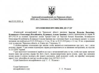 Канівський міськрайонний суд Черкаської області викликає Індутну Наталію Василівну, Бузницького Олександра Віталійовича, Бузницьку Альону Іванівну в якості відповідачів по справі № 697/2702/19 за позовом Кредитної спілки 'Кредит-Союз' до Індутної Наталії Василівни, Бузницького Олександра Віталійовича, Бузницької Альони Іванівни про стягнення боргу за договором кредиту в судове засідання, яке відбудеться 02.03.2020 року о 12 год. 30 хв. та 03.03.2020 року о 12 год. 30 хв. в приміщенні суду за адресою: Черкаська область, м. Канів, вул. Успенська, 22.