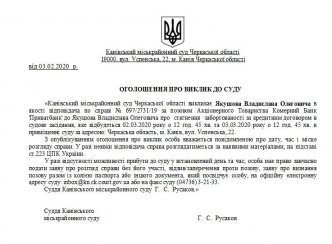 Канівський міськрайонний суд Черкаської області викликає Якушова Владислава Олеговича в якості відповідача по справі № 697/2731/19 за позовом Акціонерного Товариства Комерний Банк 'Приватбанк' до Якушова Владислава Олеговича про стягнення заборгованості за кредитним договором в судове засідання, яке відбудеться 02.03.2020 року о 12 год. 45 хв. та 03.03.2020 року о 12 год. 45 хв. в приміщенні суду за адресою: Черкаська область, м. Канів, вул. Успенська, 22.