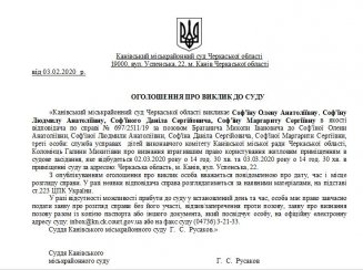 Канівський міськрайонний суд Черкаської області викликає Соф'їну Олену Анатоліївну, Соф'їну Людмилу Анатоліївну, Соф'їного Даніла Сергійовича, Соф'їну Маргариту Сергіївну в якості відповідача по справі № 697/2511/19 за позовом Братанича Миколи Івановича до Соф'їної Олени Анатоліївни, Соф'їної Людмили Анатоліївни, Соф'їна Даніла Сергійовича, Соф'їної Маргарити Сергіївни, треті особи: служба усправах дітей виконавчого комітету Канівської міської ради Черкаської області, Коломієць Галини Микитівни про визнання втратившим право користування житловим приміщенням в судове засідання, яке відбудеться 02.03.2020 року о 14 год. 30 хв. та 03.03.2020 року о 14 год. 30 хв. в приміщенні суду за адресою: Черкаська область, м. Канів, вул. Успенська, 22.