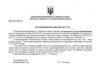 Канівський міськрайонний суд Черкаської області викликає Козловського Едуарда Геннадійовича в якості відповідача по справі № 697/69/20 за позовом Козловської Тетяни Володимирівни до Козловського Едуарда Геннадійовича про розірвання шлюбу в підготовче судове засідання, яке відбудеться 18.03.2020 року о 11 год. 00 хв. в приміщенні суду за адресою: Черкаська область, м. Канів, вул. Успенська, 22.