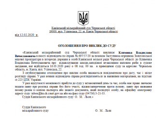 Канівський міськрайонний суд Черкаської області викликає Клименка Владислава Вячеславовича в якості відповідача по справі № 697/57/20 за позовом Заступника керівника Золотоніської міцевої прокуратури в інтересах держави в особі Канівської міської ради Черкаської області до Клименка Владислава Вячеславовича про відшкодування шкоди,заподіяної незаконним виловом риби в судове засідання, яке відбудеться 16.03.2020 року о 08 год. 00 хв. в приміщенні суду за адресою: Черкаська область, м. Канів, вул. Успенська, 22.