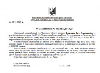 Канівський міськрайонний суд Черкаської області викликає Василенко Інгу Олександрівну в якості відповідача по справі № 697/189/20 за позовом Василенка Павла Олександровича до Василенко Інги Олександрівни про розірвання шлюбу в судове засідання, яке відбудеться 19.03.2020 року о 08 год. 45 хв. в приміщенні суду за адресою: Черкаська область, м. Канів, вул. Успенська, 22.