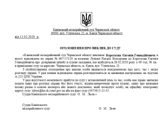 Канівський міськрайонний суд Черкаської області викликає Короткова Євгенія Геннадійовича в якості відповідача по справі № 697/173/20 за позовом Луніної Наталії Вікторівни до Короткова Євгенія Геннадійовича про розірвання шлюбу в судове засідання, яке відбудеться 28.02.2020 року о 09 год. 00 хв. в приміщенні суду за адресою: Черкаська область, м. Канів, вул. Успенська, 22.