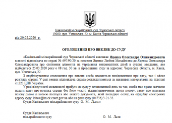 Канівський міськрайонний суд Черкаської області викликає Яценка Олександра Олександровича в якості відповідача по справі № 697/90/20 за позовом Яценко Любові Михайлівни до Яценка Олександра Олександровича про стягнення аліментів на утримання неповнолітніх дітей в судове засідання, яке відбудеться 25.03.2020 року о 08 год. 30 хв. в приміщенні суду за адресою: Черкаська область, м. Канів, вул. Успенська, 22.